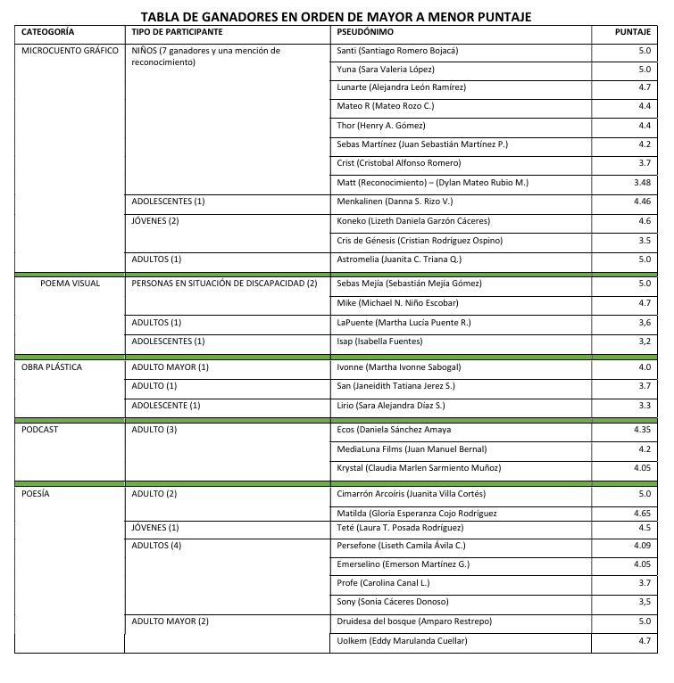 - RESULTADOS: 77 inscritos, 41 obras presentadas, 30 ganadores y un reconocimiento (mejores puntajes en general y por categoría.